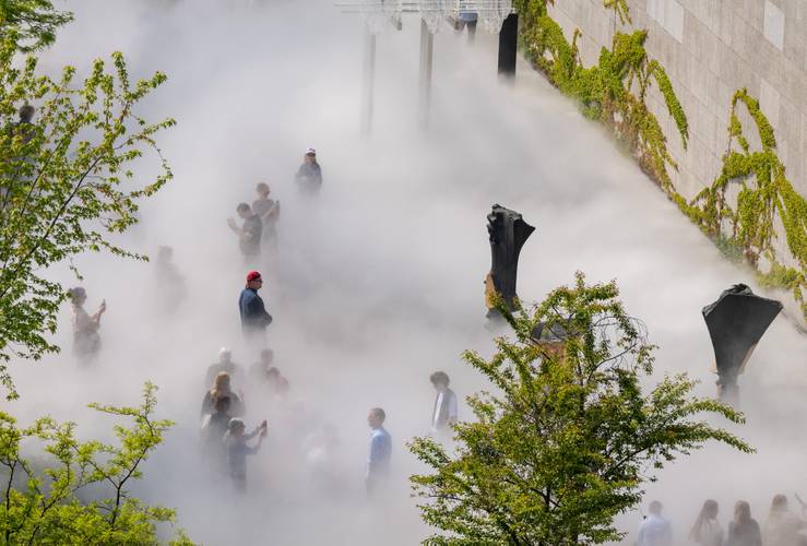 Ebenso können Besucher*innen direkt in das Nebelgeschehen eintauchen. Von der ostseitigen Terrasse aus eröffnet sich zudem ein Blick von oben – auf den Nebel, der durch den Garten zieht, sich mit den Bäumen und den Skulpturen von Henri Laurens, Wolfgang Mattheuer oder Alicja Kwade vermischt und schließlich in den Himmel auflöst.