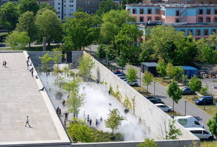 Durch den Nebel kann der Boden nass und rutschig werden, bitte seien Sie vorsichtig. Halten Sie ausreichend Abstand zu Skulpturen, Wasserbecken und anderen Besucher*innen. Achten Sie besonders auf unebene Bodenflächen und mögliche Stolperstellen. Begleiten Sie Kinder jederzeit und behalten Sie sie im Blick. Fotografieren und Filmen ist willkommen. Bitte beachten sie, dass der feine Wassernebel elektronische Geräte beeinträchtigen kann.
